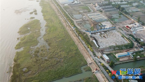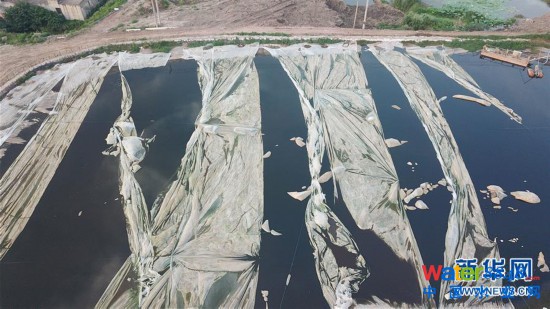 泰興市濱江鎮(zhèn)頭圩村緊靠長江岸邊的污泥堆積池(6月11日無人機拍攝)。